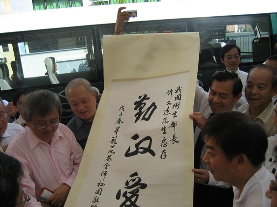 本会与29巷的其他团体当天准备了各种节目,欢迎部长的到来.我们还准备了一张由会员邱荣通先生画的部长肖象送给部长.全巷的团体也合资请书法家曾传伟写 了幅字画"勤政爱民"赠给我们的贵宾.