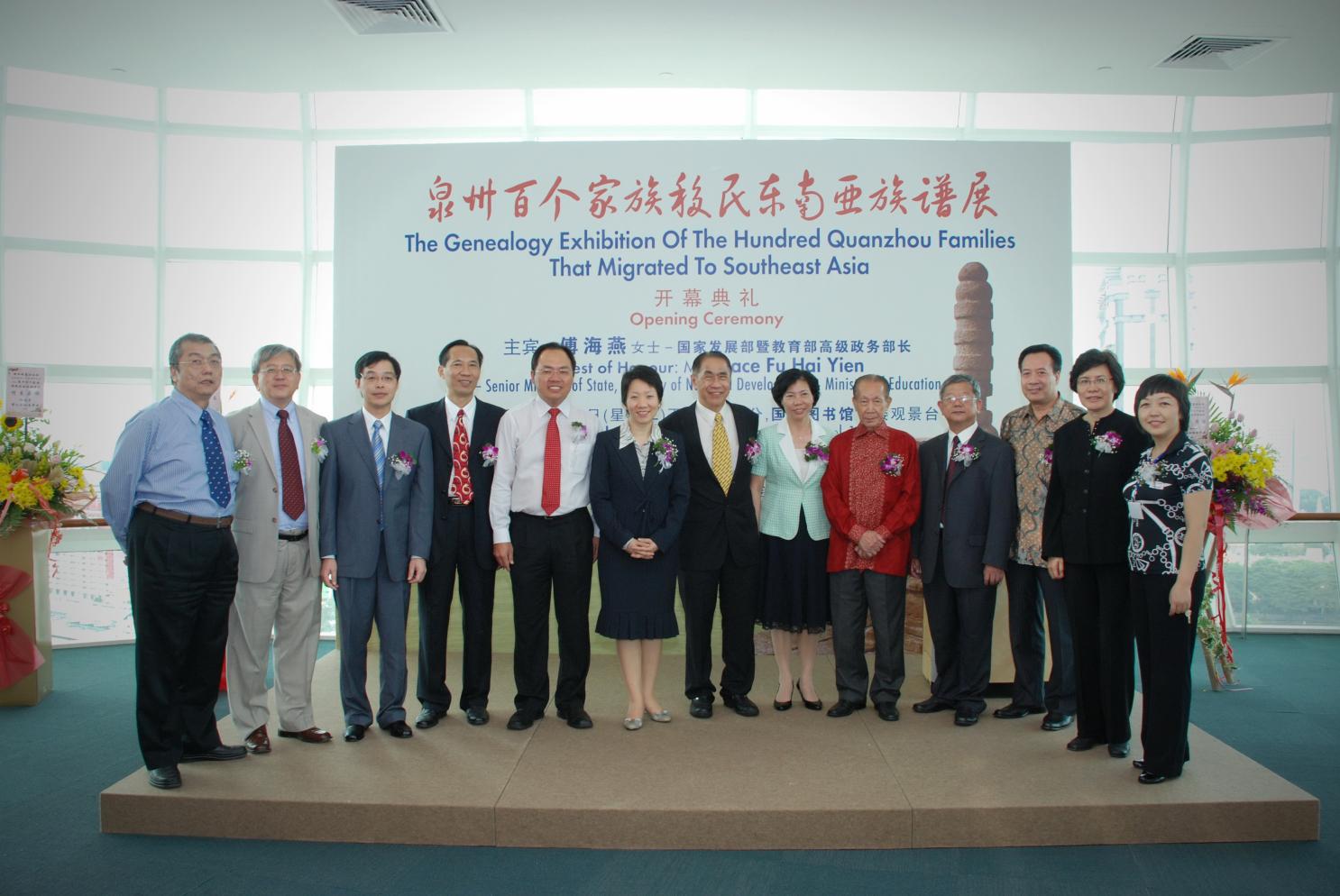 本展览于2009年10月27日下午假图书馆16楼观景台举行隆重开幕礼,由国家发展部暨教育部高级政务部长傅海燕女士主持开幕仪式。当天下午图书馆16 楼冠盖云集,来宾衆多,我们摆了120多张椅子,座无虚席,挤挤一堂,场面热烈。重要的来宾包括了我会会务顾问连荣华国会议员,老会长张文元先生,宗乡总 会秘书长林方华先生,各泉属会馆的主要领导等;尤其难得的是许多德高望重的乡贤前辈也都出现在会场,这令我们感动不已。傅部长在她的开幕演词中说:这个展 览为大家提供了一个近距离接触、翻阅、審查族谱的机会,这肯定会增加我们对族谱这种文献的认识,有助於我们多了解中国的传统文化进而促使我们更重视自己文 化的“根”。只有当我们了解了历史:家族的历史,国家的历史,我们才会更珍惜当下拥有的一切,才会对未来更具信心与期望。谢会长在致词时则说:先辈远渡重 洋,到新加坡扎根,披荆斩棘建设新家园,但对于祖先的足迹,许多年轻人连说出祖籍都有困难,他希望移民后裔都有寻根的渴望。