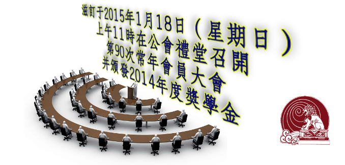 兹订于2015年1月18日 ( 星期日 ) 早上11时在公会礼堂召开第90次常年会员大会,大会除了报告会务、全年财政收支账目外,同时也将颁发2014年度奖学金。